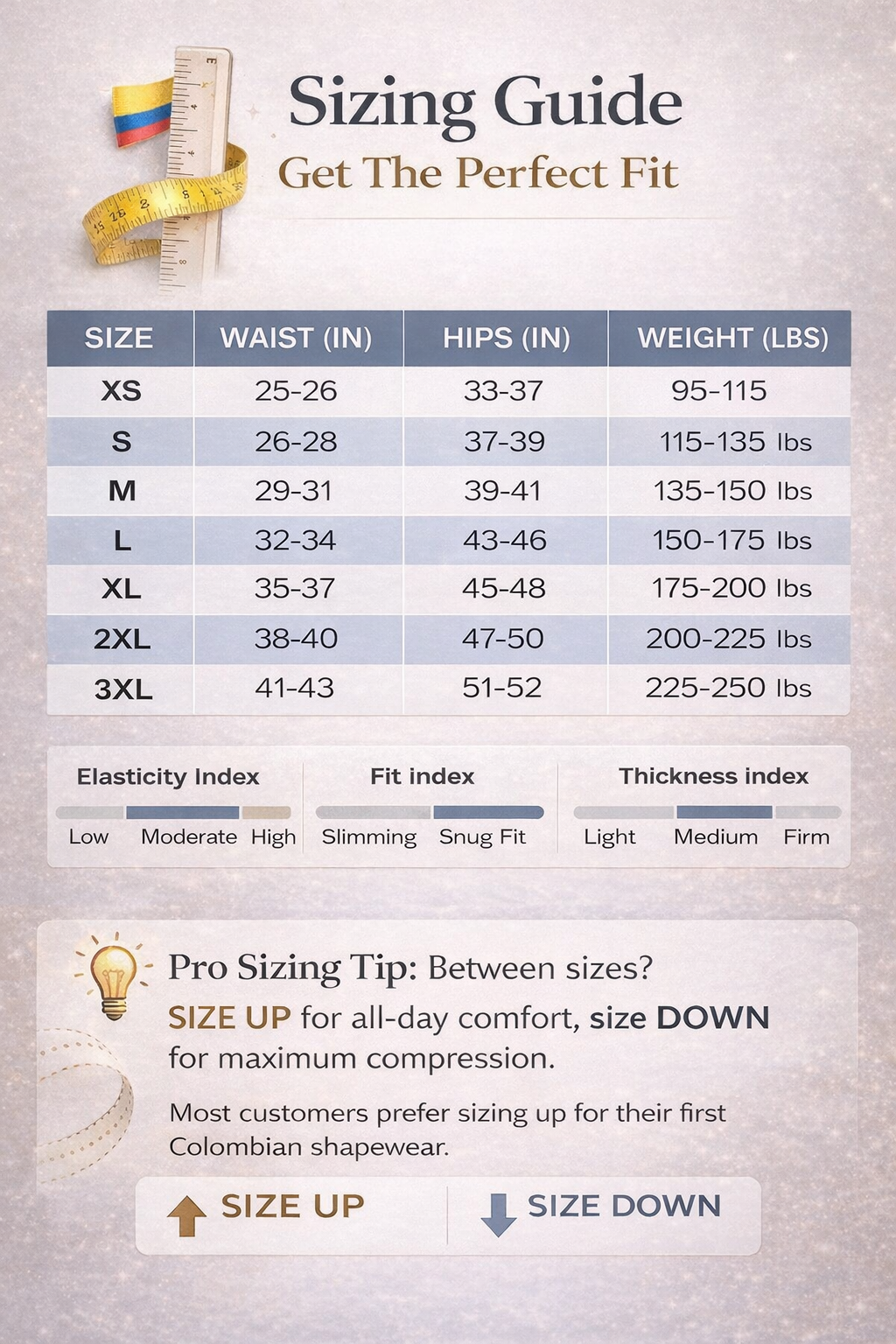 Use our size chart based on your waist, hips, and bust measurements for the best fit.